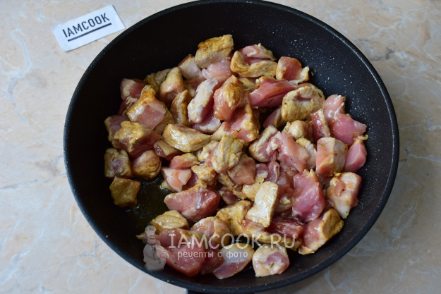 Свинину нарежьте на кусочки и обжарьте на горячей сковороде с добавлением растительного масла. Долго жарить не надо. На сильном огне быстро появится на мясе золотистая корочка. Мясо немного подсолите.