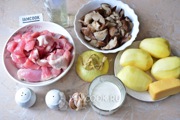Для приготовления мяса по-боярски в горшочке в духовке подготовьте необходимые ингредиенты. Грибы можно использовать любые. У меня - белые грибы, которые отварены в кипящей воде около 30 минут. Свинину выбирайте без костей. Картофель очистите от кожуры и ополосните от загрязнений. Сливки можно брать любой жирности. Чем выше жирность, тем сливочнее будет вкус. Жирные сливки можно немного развести водой.