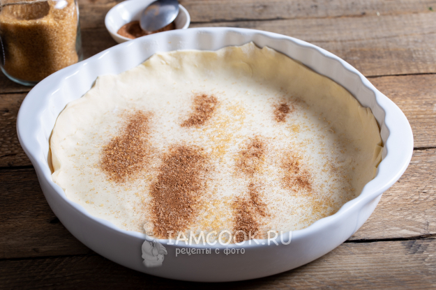 Смешайте корицу с коричневым сахаром и 1/3 смеси присыпьте равномерно тесто.