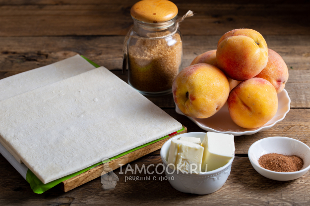 Подготовьте указанные продукты для приготовления пирога из слоеного теста с персиками (свежими). Тесто бездрожжевое, его следует предварительно правильно разморозить. Персики свежие весят где-то 500 г. Включите разогреваться духовку до 180 градусов.