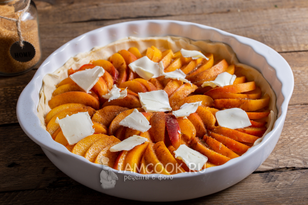 Сверху равномерно тонкими пластинами разложите сливочное масло. Если бортики высокие, то можно их подвернуть внутрь пирога. Поставьте открытый слоеный пирог с персиками в предварительно разогретую духовку на 35 минут.