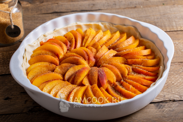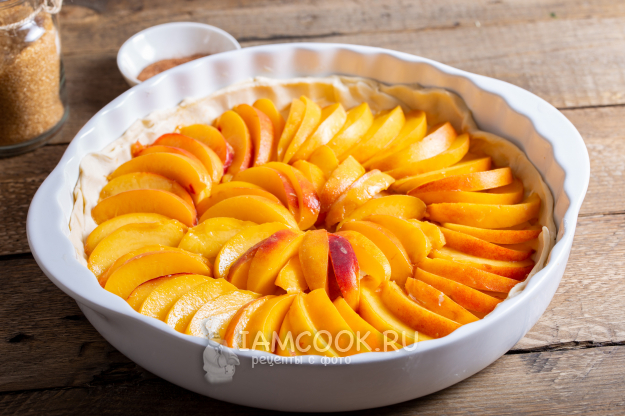 Персики помойте, обсушите. Разрежьте пополам и уберите косточку. Порежьте персики дольками и выложите по кругу поверх теста.