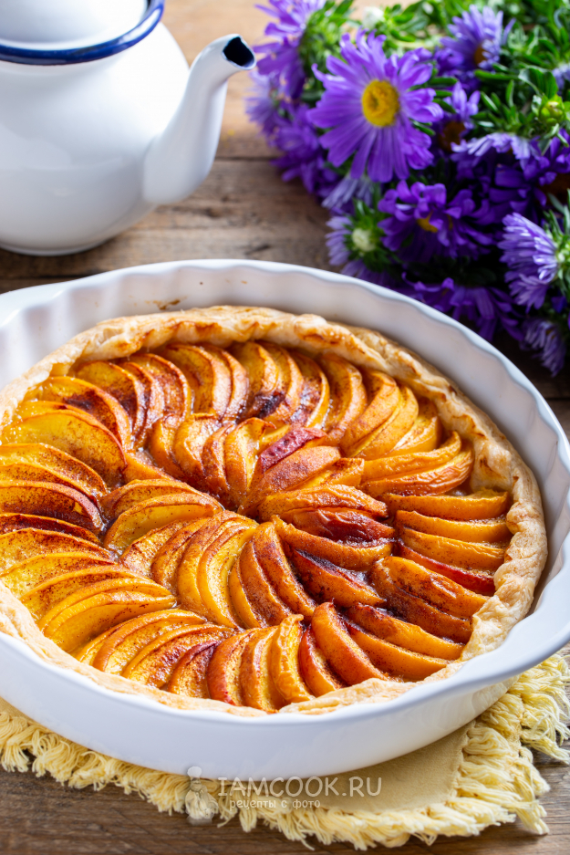Готовый пирог из слоеного теста с персиками подавайте горячим, предложив к нему шарик мороженого и горячие напитки. Приятного аппетита!