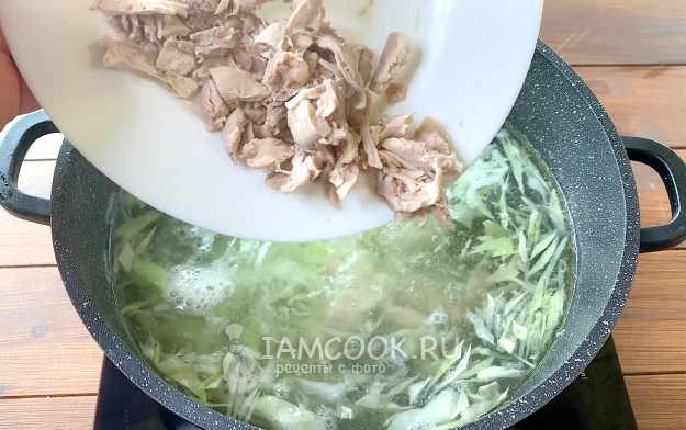 Из бульона извлеките мясо, остудите и разделите на кусочки. Нашинкуйте капусту и опустите в бульон, варите около 15 минут на среднем огне, затем верните мясо в бульон.