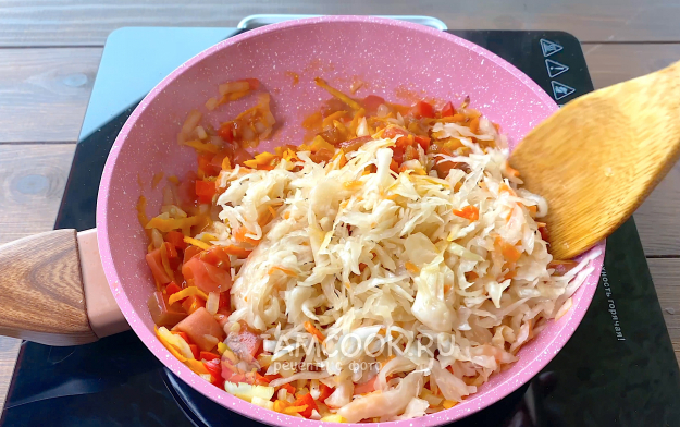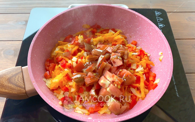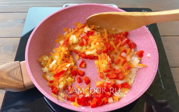 Разогрейте сковороду с растительным маслом, выложите нарезанный лук, тертую морковь, нарезанный перец. Обжарьте до мягкости.