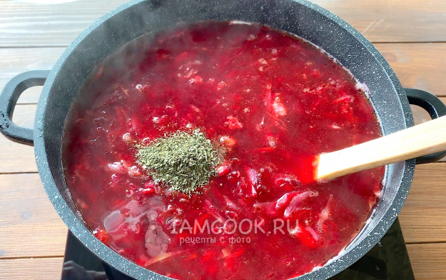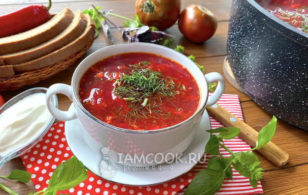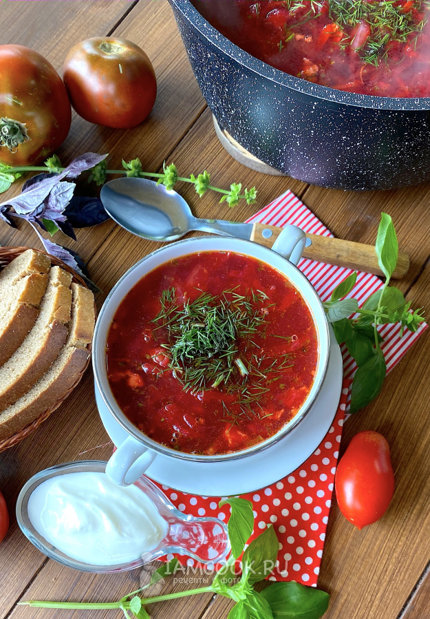 Наваристый, ароматный борщ со свежей и квашеной капустой готов. Подают его в горячем виде со свежей зеленью и сметаной.
