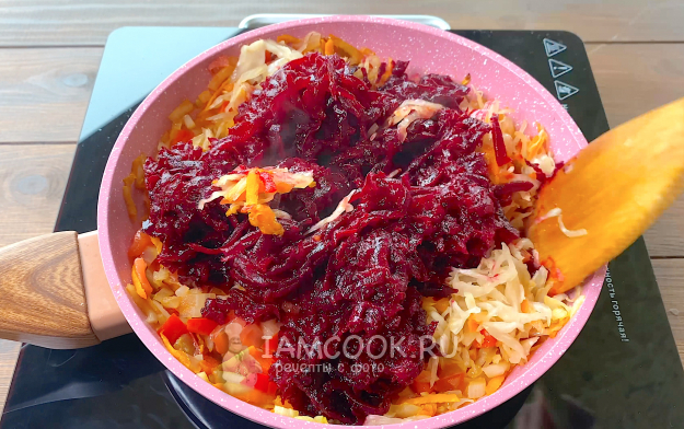 Натрите свеклу и выложите в сковороду. Перемешайте, прикройте крышкой и тушите на умеренном огне около 30 минут.