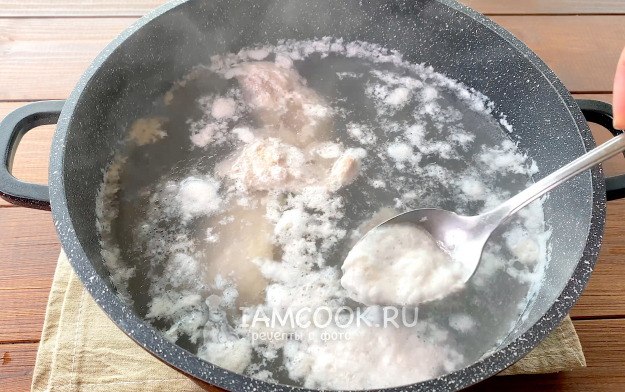 Выложите мясо в кастрюлю, залейте холодной водой. Поставьте на средний огонь, доведите до кипения и снимите пенку. Добавьте лавровый лист и варите на умеренном огне около 30 минут.