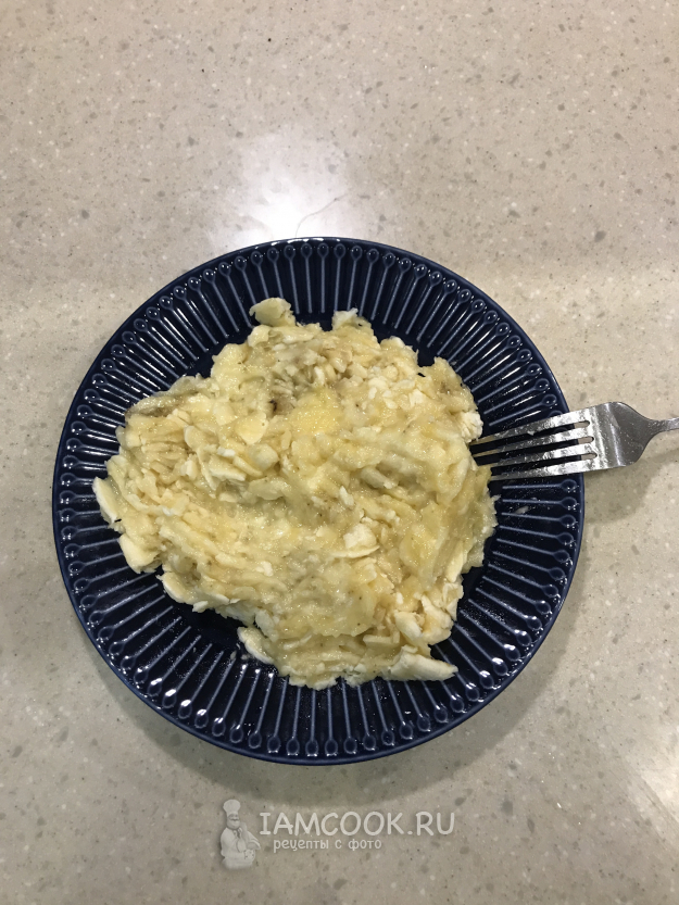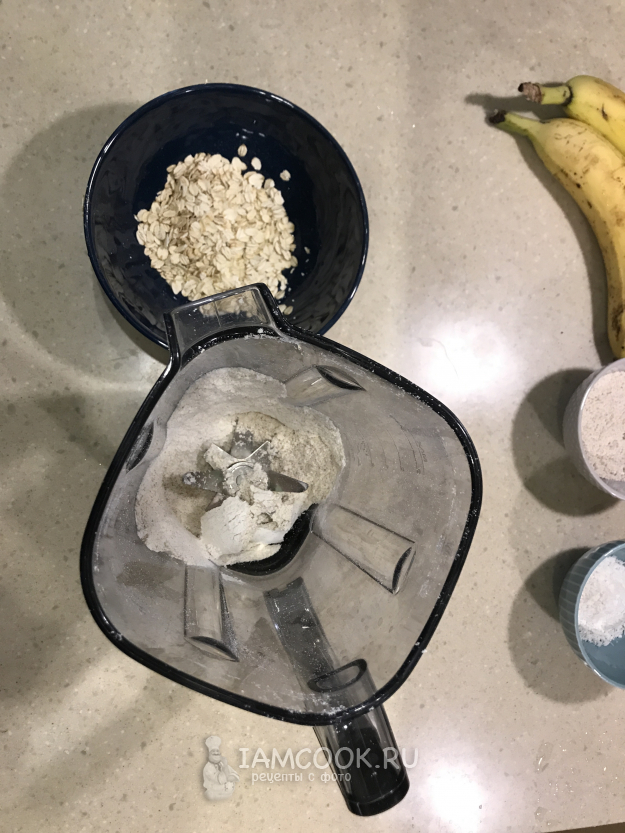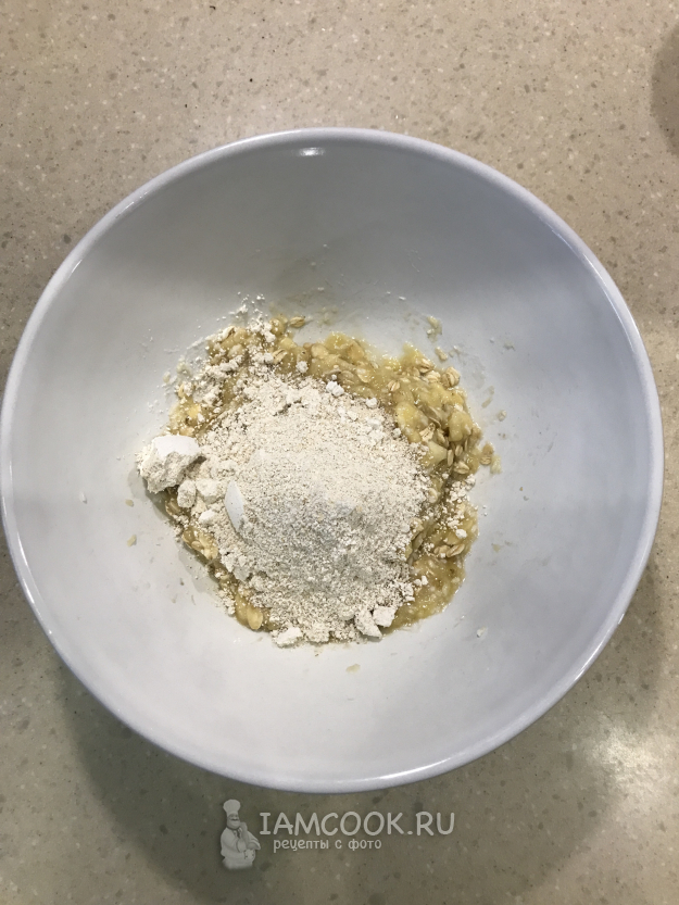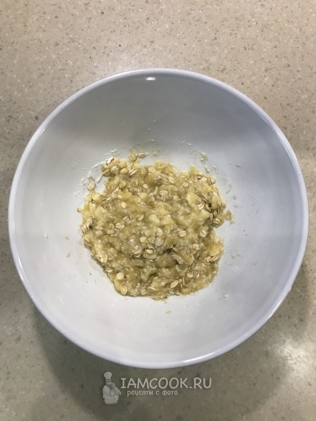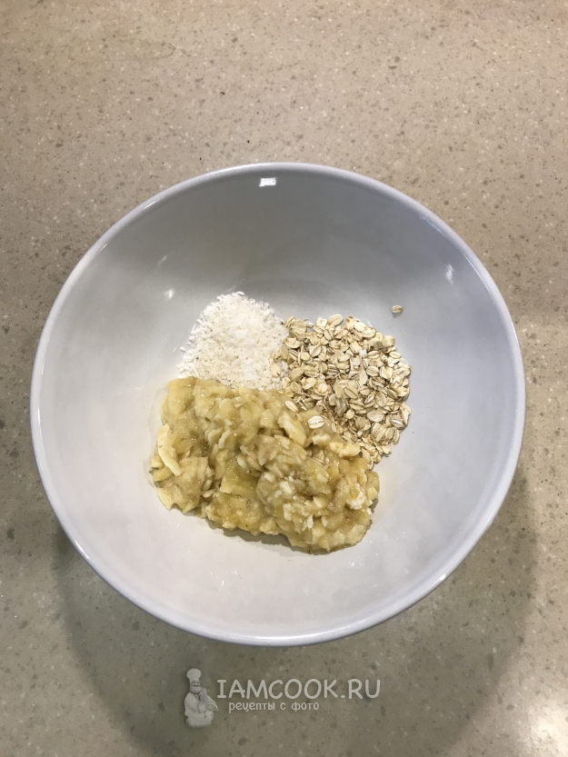 Выложить в глубокую чашу размятые бананы, 50 граммов овсянки и кокосовую стружку. Кстати, кокосовая стружка тут - не обязательный компонент, можете ее вовсе не добавлять, либо заменить на семечки или дробленые орехи.