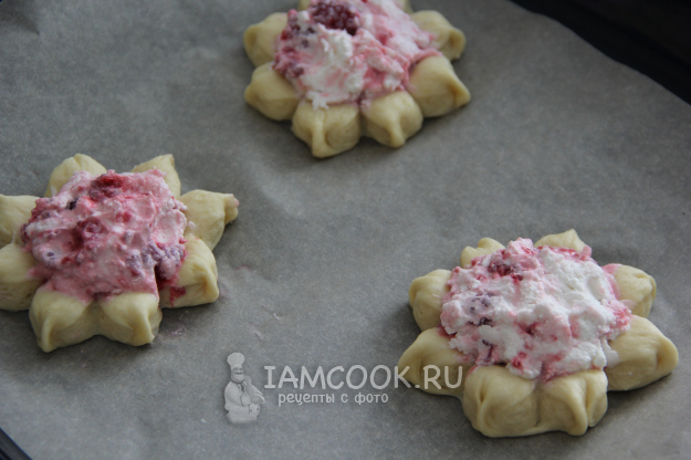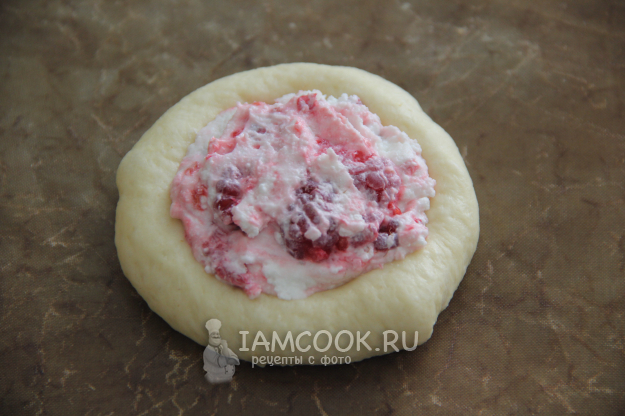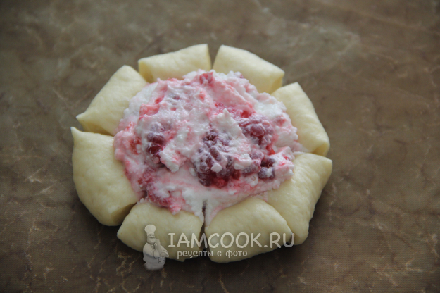 Выложить творожную начинку в середину булочки.