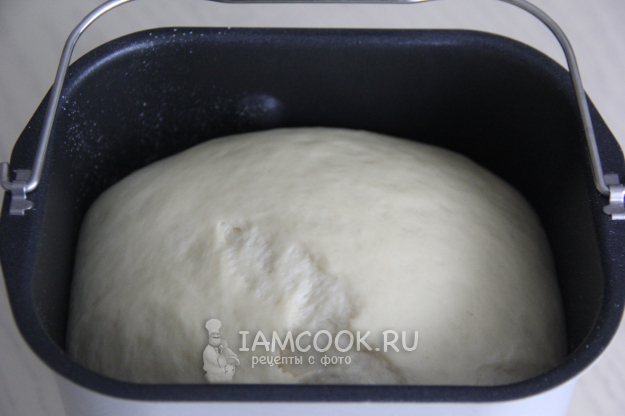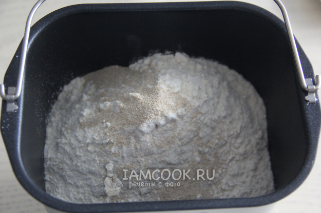 Всыпать просеянную муку и дрожжи. Выставить режим "замес теста" 1,5 часа.