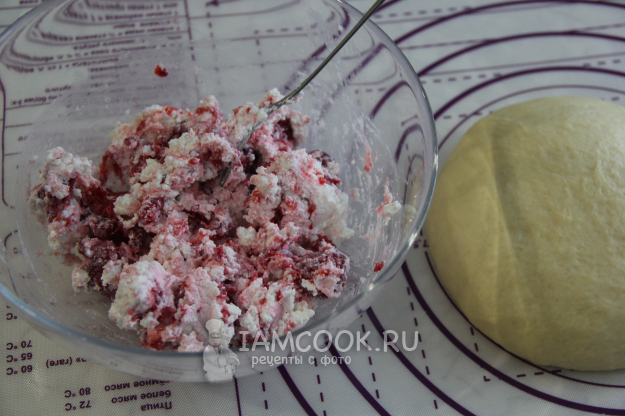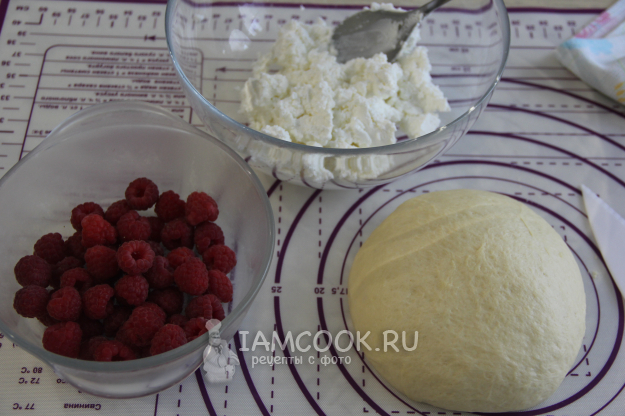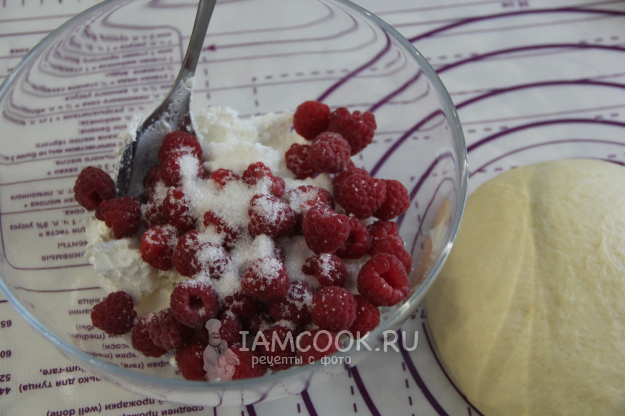 Тесто обмять и дать отдохнуть на столе под полотенцем. Для начинки соединить творог, сахар и малину. Малину предварительно перебрать и удалить листики.