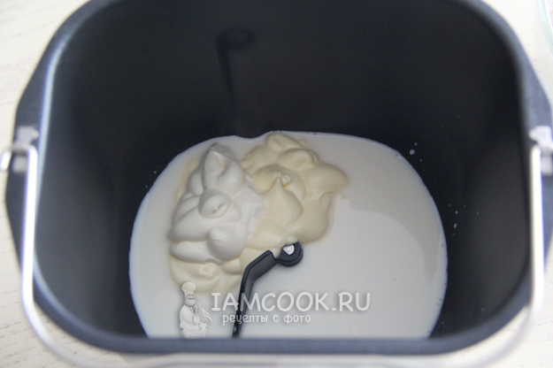 Я замес теста делала в хлебопечке. В ведерко влить молоко, воду, всыпать сахар и соль. Добавить майонез.