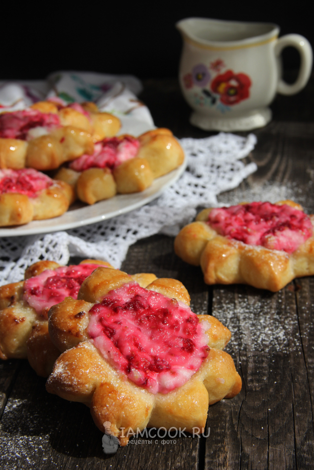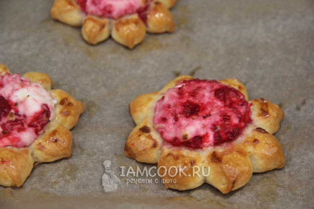 Выпекать булочки с малиной и творогом в разогретой духовке при 200 градусах примерно 25 минут.