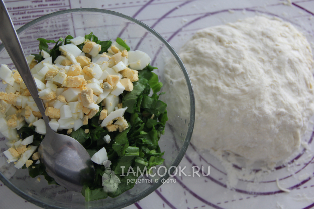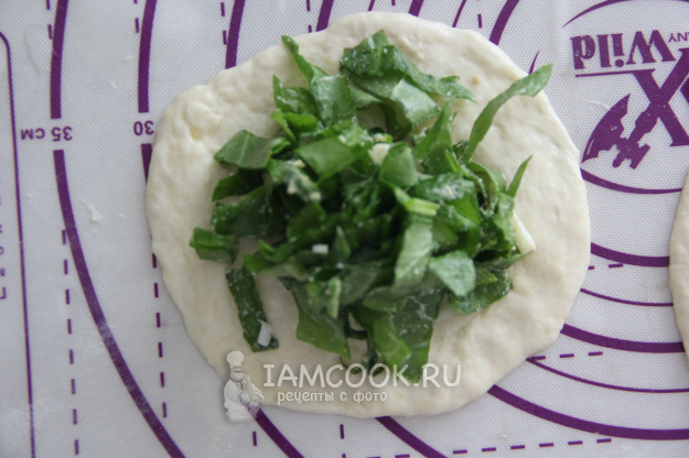 Выложить начинку на тесто. Учтите, что во время выпекания щавель обмякнет, поэтому начинку выкладываем пышной шапкой.