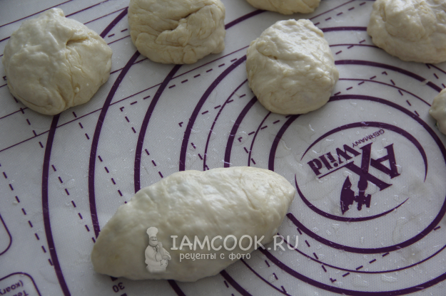 Тесто разделить на небольшие части, размер пирожков выбирайте сами. Руки смазать растительным маслом и сформировать не тонкие лепешки.