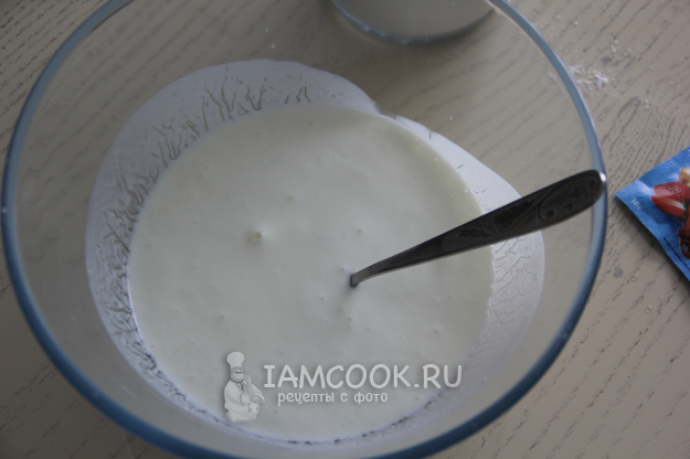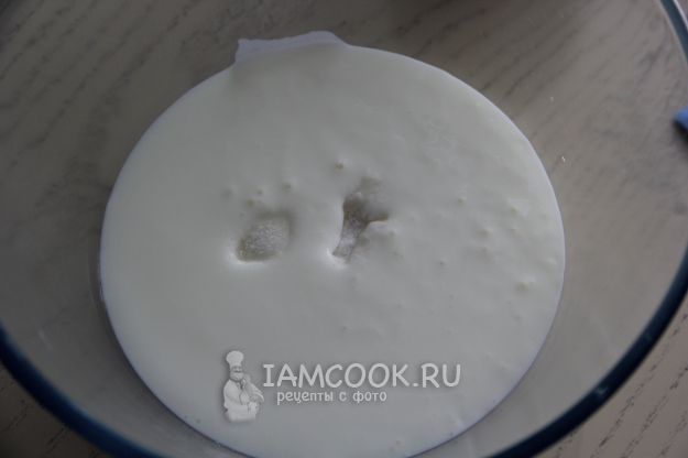 В кефир всыпать соду, соль и сахар. Перемешать и оставить на 5-7 минут.