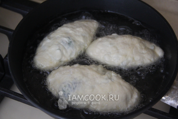 Жарить пирожки со щавелем и яйцом на среднем огне с двух сторон до золотистого цвета.