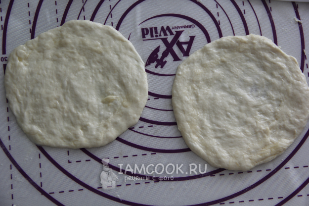 Перемешать начинку, можно слегка посолить. Тесто выложить на силиконовый коврик, припыленный мукой.