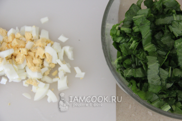 Щавель намыть и нарезать на полоски, не мелко. Яйца предварительно сварить и остудить. Почистить яйца и мелко нарезать.