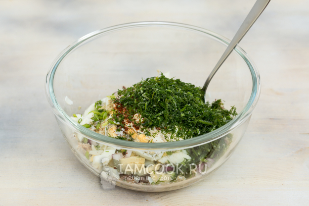 Добавьте горчицу, паприку, табаско, нарезанный мелко укроп, соль, перец и йогурт.