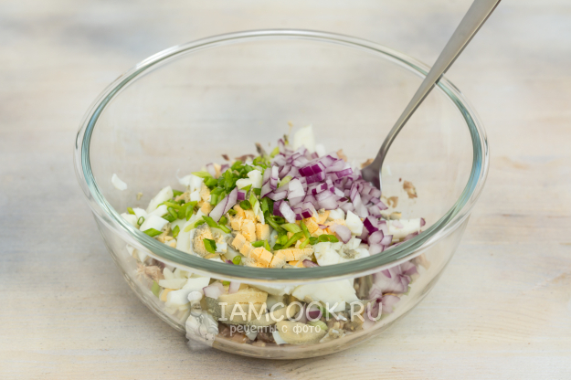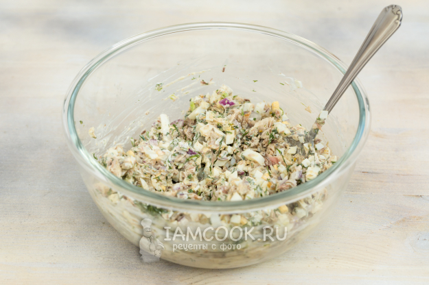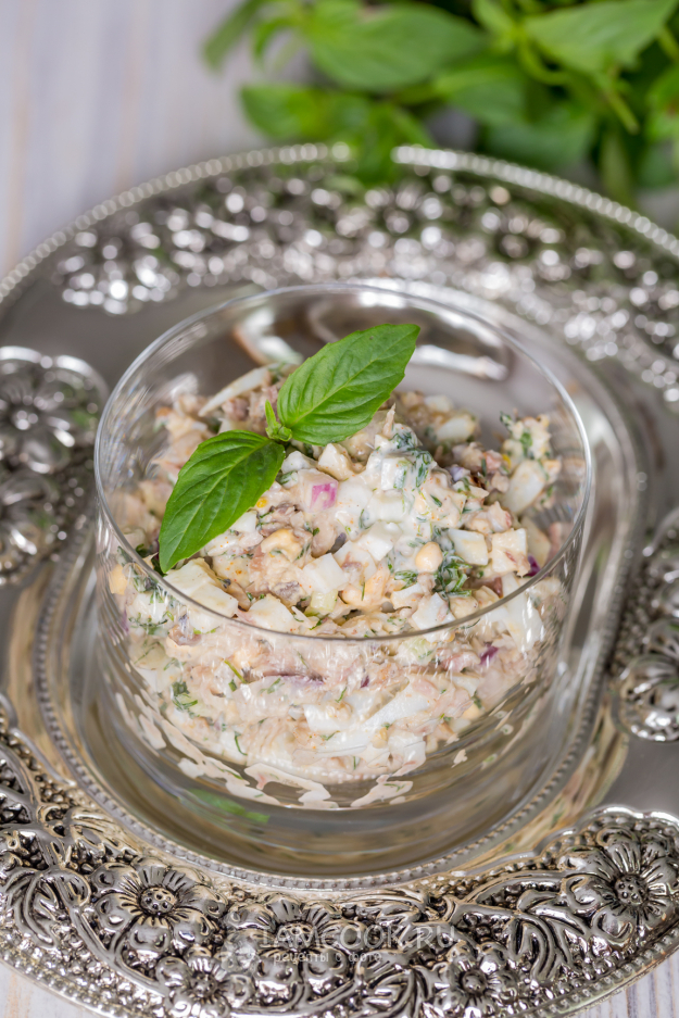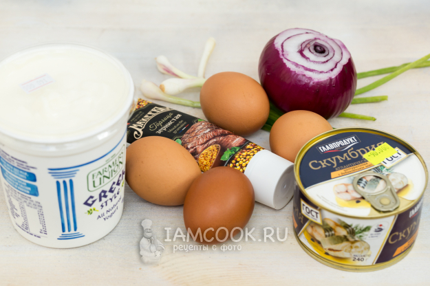 Для приготовления салата с консервированной скумбрией и яйцом подготовьте продукты по списку.