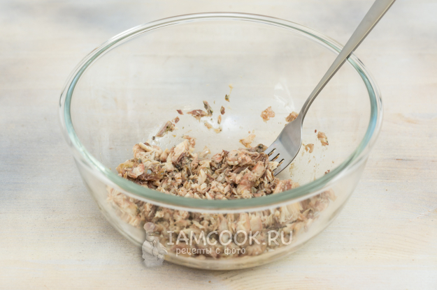 Из банки со скумбрией слейте жидкость, из рыбы удалите хребет.