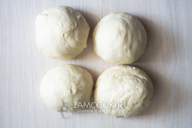 Всю массу теста выложим на рабочую поверхность и разделим на 4 части. Каждую часть подкатаем в шар и отставим в сторону на 20 минут, прикрыв кухонным полотенцем или пищевой пленкой.