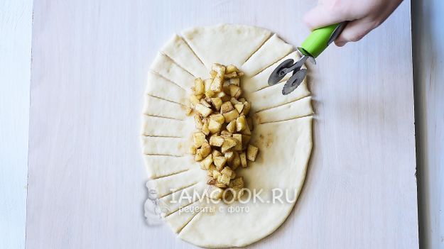 Приступим к формовке плетенок. Возьмем одну часть теста и раскатаем на рабочей поверхности в виде овала толщиной в 2-3 мм. Если есть необходимость, то предварительно следует припылить рабочую поверхность небольшим количеством муки. На середину овала выложим 1/4 часть от всего количества яблочной начинки. Свободные края теста нарежем ножом в виде полос шириной 1-1,5 см.