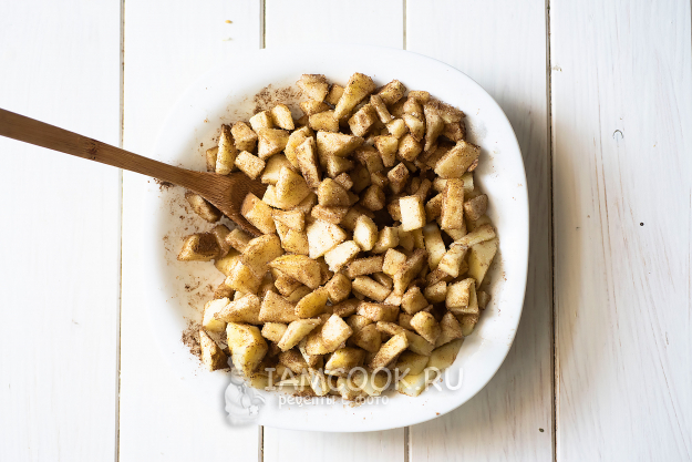 Яблочные кубики выложим в миску, добавим сахар и корицу, перемешаем.
