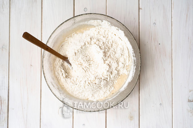 Частями будем добавлять просеянную муку, вмешиваем сначала ложкой, затем замес производим руками.