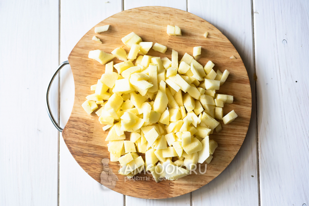 За это время успеем приготовить начинку. С яблок снимем кожуру, удалим хвостики и семенной отдел. Нарежем мякоть небольшими кубиками.