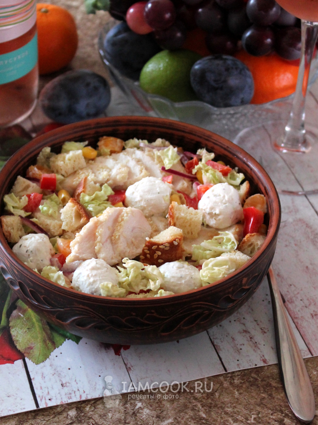 Сверху уложите нарезанные ломтики куриного филе в кунжуте, добавьте сырные шарики и сухарики из белого хлеба в количестве на свой вкус.