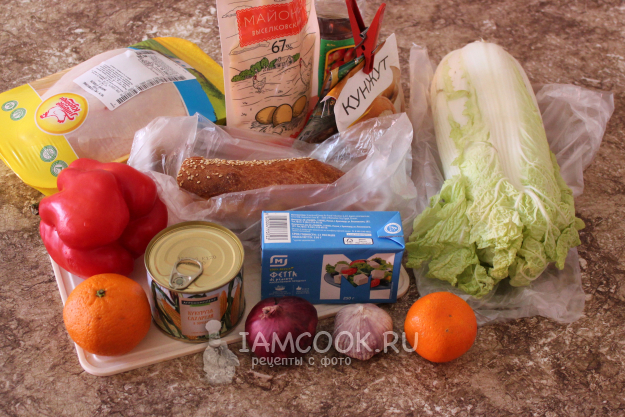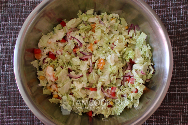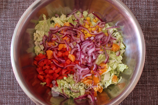 Нежную часть пекинской капусты нашинкуйте. С кукурузы слейте жидкость. Перец сладкий болгарский нарежьте кубиком. С лука слейте маринад. Мандарин очистите, разберите на дольки и каждую дольку нарежьте на 3-4 кусочка. Соедините пекинскую капусту, кусочки перца и мандарина, маринованный лук и зерна консервированной кукурузы.