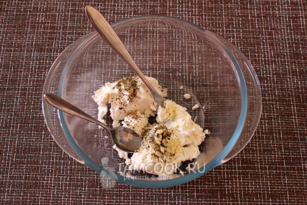 Сыр фета или тому подобный продукт разомните вилкой, добавьте в него измельченный зубчик чеснока и сухие прованские травы, а лучше бы свежий рубленый базилик. Перемешайте и сформируйте шарики.