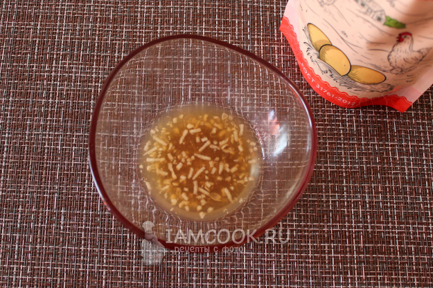 Для заправки соедините сок из одного мандарина, измельченный или тертый зубчик чеснока и майонез. Перемешайте, консистенция будет жидковатой... Для большей пикантности можете ещё влить немного соевого соуса по вкусу.
