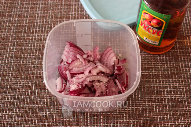 Красный лук нашинкуйте и замаринуйте, т.е. просто добавьте соль, сахар и яблочный уксус. Оставьте, пока занимаетесь остальными ингредиентами.