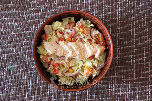 Разложите по порционным тарелкам основную (овощную) часть салата.
