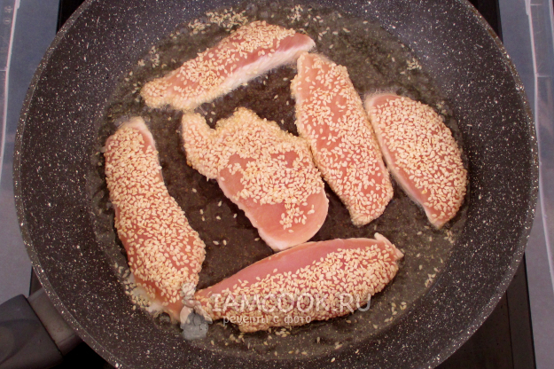 Филе куриной грудки нарежьте ломтями толщиной около 1 см, слегка посолите. С одной стороны каждый кусок обмакните в семена кунжута.