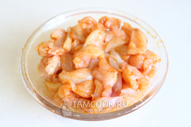 Замаринуйте мясо: заправьте маслом и специями (копчёная паприка, сушеный чеснок), тщательно перемешайте и оставьте в стороне.