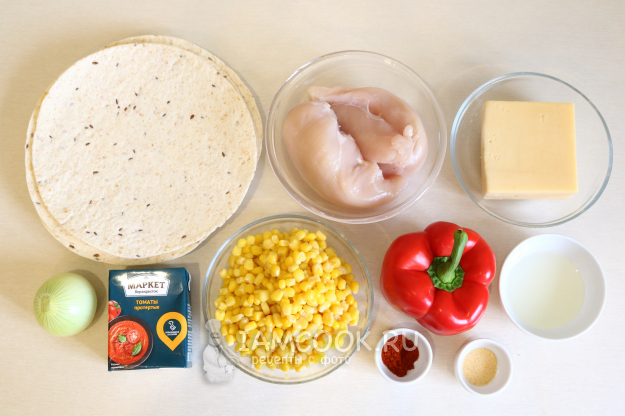 Все ингредиенты для кесадильи с курицей и кукурузой собраны, можно приступать к приготовлению.