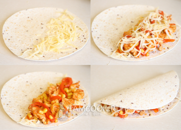 Сформируйте кесадилью: на половину тортильи выложите немного сыра, сверху положите начинку, затем снова посыпьте сыром и закройте второй половинкой тортильи.