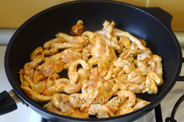 На хорошо разогретую сковороду выложите замаринованное куриное филе и обжарьте 3-5 минут на среднем огне.