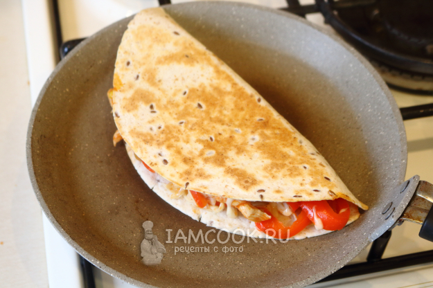 Обжарьте кесадилью с двух сторон на сухой горячей сковороде до румяности (по 2-3 минутки). Чтобы кесадилья не раскрывалась, немного прижмите лопаткой сверху.