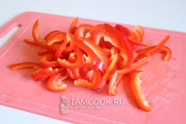Болгарский перец очистите, промойте и нарежьте тонкими полосками.