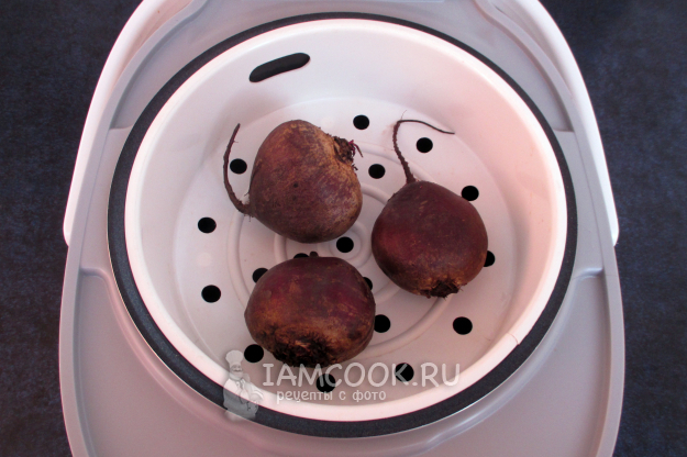 Приготовьте свёклу, т.е. сварите её в кожуре в кастрюле на плите или запеките в духовке в фольге заодно/параллельно с каким-то блюдом, или на пару - например, в течение 25 минут в мультиварке.