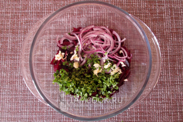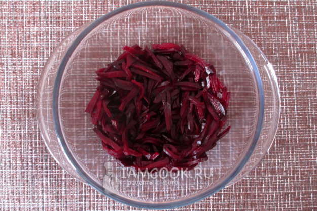 Дайте свекле остыть, очистите и тонко нарежьте брусочками или соломкой. В принципе, можно и натереть её на крупной терке.