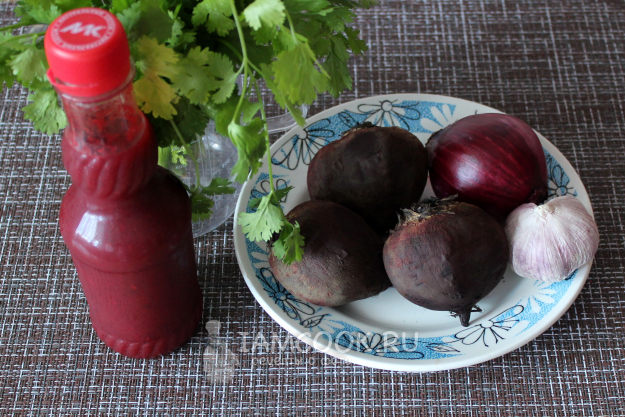 Для салата из свеклы по-грузински подготовьте ингредиенты по списку к рецепту.
