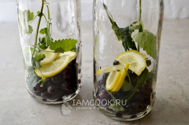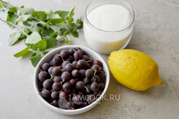 Подготовьте продукты для компота: крыжовник, сахар, лимон и мелиссу.
