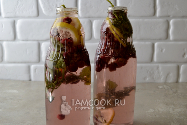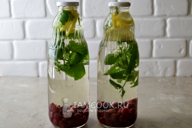 Добавьте в бутылки по веточке мелиссы и по два кружочка лимона, разрезанного на части.